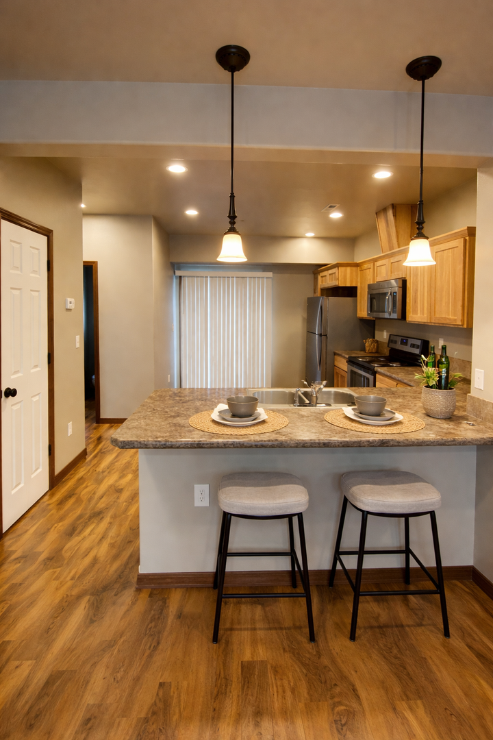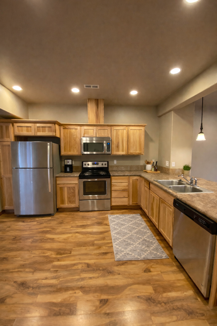 • Stove/oven, dishwasher, refrigerator with ice maker, built-in microwave