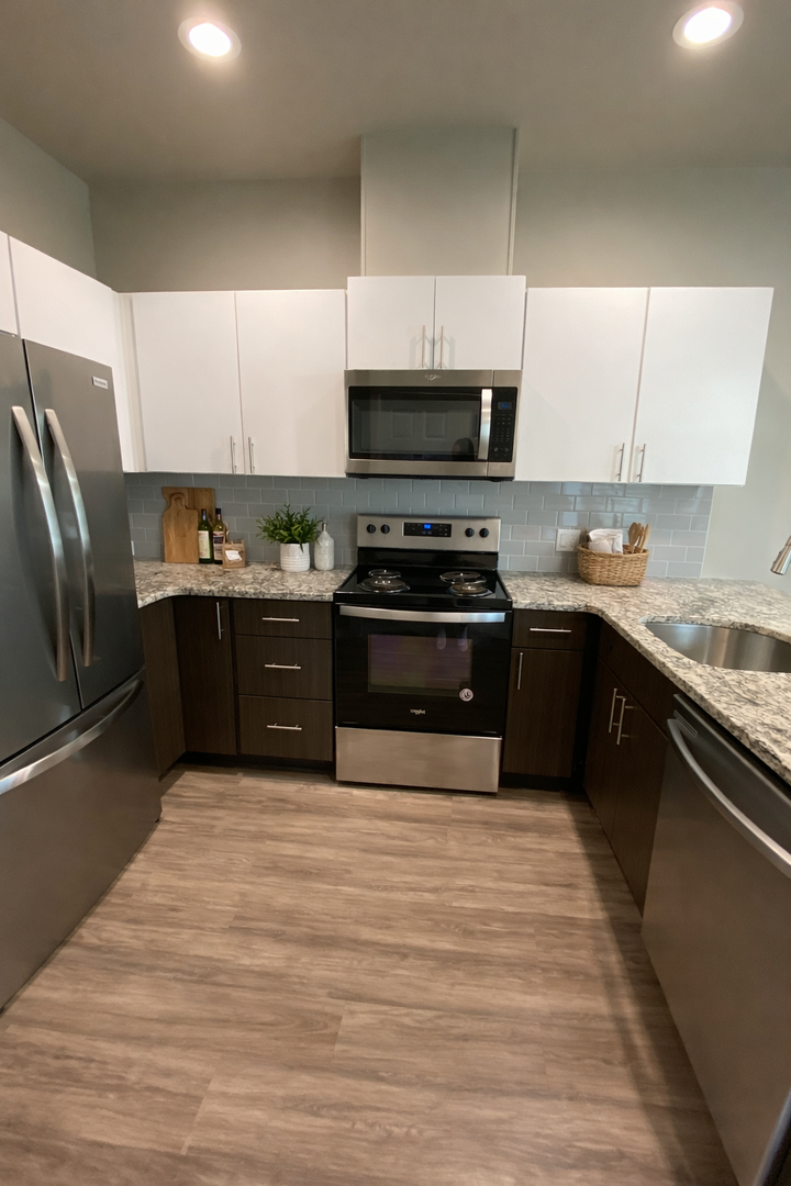 • Full kitchen: fridge/freezer, stove/oven, dishwasher, microwave
