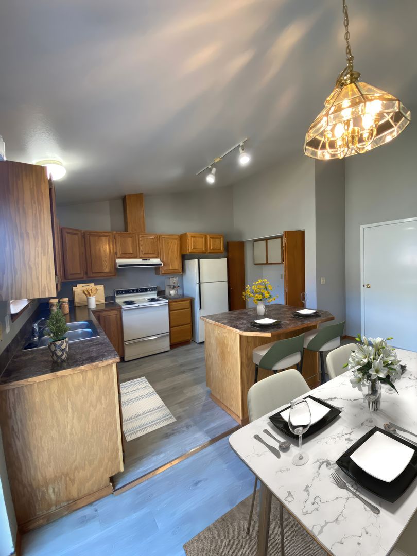 • Fully Equipped Kitchen – Fridge/freezer, stove/oven, dishwasher & garbage disposal (because dishes should not win).