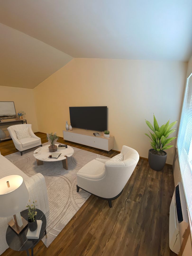 • Living Room – Vaulted ceilings, LVP flooring, and plenty of natural light